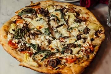 artichoke, shiitake mushrooms, spinach, oven-roasted tomatoes, goat cheese and a three cheese blend