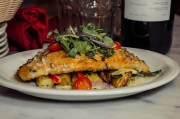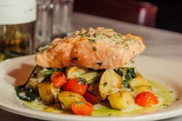 grilled Atlantic salmon, lemon-caper butter sauce, roasted potatoes, artichoke, spinach, and heirloom tomatoes