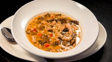 classic Tuscan soup with chicken, pancetta, white beans, and kale
