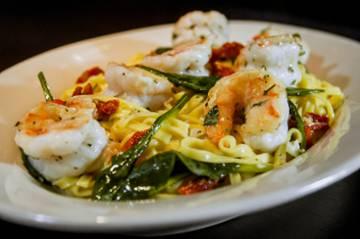 sautéed shrimp, sun-dried tomatoes, spinach, fresh egg pasta, garlic, butter, white wine