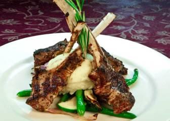 grilled lamb chops, mint salsa verde, cabernet demi-glace, roasted potatoes, asparagus, broccolini, and spinach