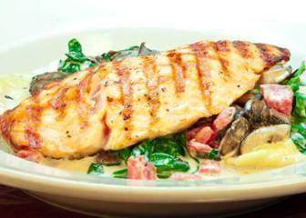 grilled North Atlantic salmon served over cheese ravioli with sautèed spinach, wild mushrooms, and tomato in garlic cream sauce