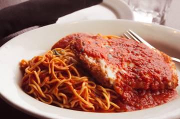 breaded chicken with Italian seasoning, mozzarella cheese and tomato sauce, served over spaghetti