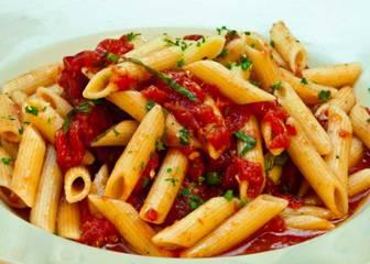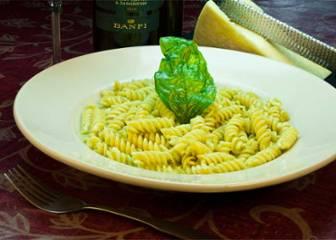 spiral pasta with grilled chicken, pesto, cream, sun-dried tomatoes, pine nuts and Parmesan