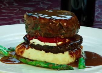 herb rubbed filet on a portobello mushroom with tomato, goat cheese, finished with a red wine demi glace, patate del giorno, and grilled asparagus